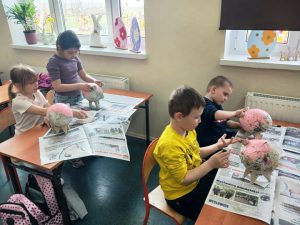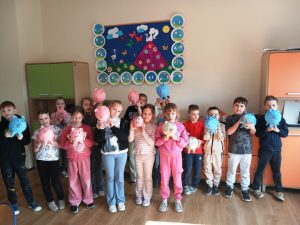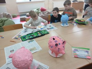 Uczniowie klasy 1a, 1b, 1c, 1d zakończyli wieloetapowe warsztaty plastyczne tworzenia skarbonki metodą papier- mache (mąka i gazety). Podczas trzeciego etapu warsztatów dzieci eksperymentowały z kolorami, malowały pędzlem, gąbką strukturę skarbonki, ozdabiały swoje dzieła. Samodzielne wykonanie skarbonki sprawiło dzieciom dużo radości. Warsztaty były bardzo kreatywne, wymagały dużej cierpliwości, koncentracji i twórczego myślenia. Efektem warsztów są piękne skarbonki!