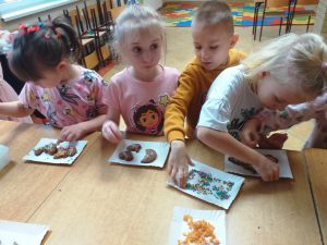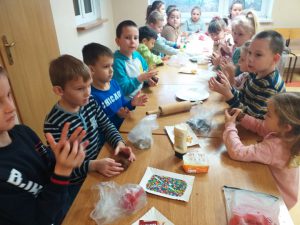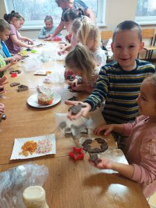 Grupa przedszkolna "Motylki" uczestniczyła w warsztach kulinarnych, w ramach których powstały pierniczki. Dzieci poznały tajniki przepisu, miały okazję zapoznać się z niezbędnymi przyprawami i składnikami do ciasta takimi jak goździki, cynamon, miód, cytryna, mąka. Każdy kucharz miał za zadanie wyrobić swoje ciasto, następnie rozwałkować i wykroić dany kształt za pomocą foremki. Zapach pieczonego ciasta rozchodził sie po całej szkole. Następnie dzieci za pomocą lukru, czekolady, posypki i skórki pomarańczy ozdabiały ciasteczka. Zadanie sprawiło dzieciom niesamowitą frajdę! Zadanie zrealizowane zostało w ramach innowacji pedagogicznej Sensoryczna podróż po Polsce – Poznaj Polskę wszystkimi zmysłami. Koordynatorzy: Murach Magdalena, Ilona Krzyżan.