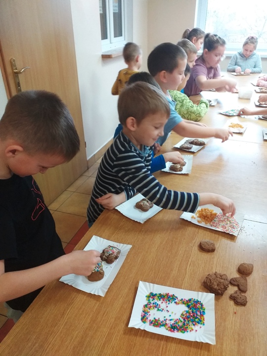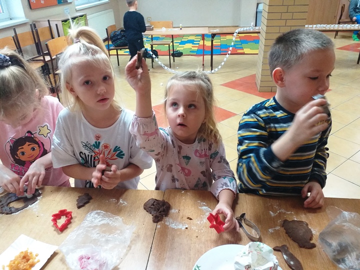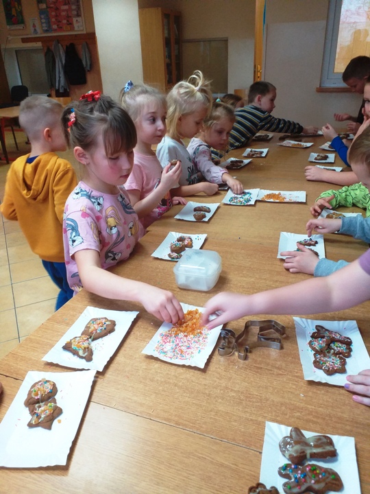 Grupa przedszkolna "Motylki" uczestniczyła w warsztach kulinarnych, w ramach których powstały pierniczki. Dzieci poznały tajniki przepisu, miały okazję zapoznać się z niezbędnymi przyprawami i składnikami do ciasta takimi jak goździki, cynamon, miód, cytryna, mąka. Każdy kucharz miał za zadanie wyrobić swoje ciasto, następnie rozwałkować i wykroić dany kształt za pomocą foremki. Zapach pieczonego ciasta rozchodził sie po całej szkole. Następnie dzieci za pomocą lukru, czekolady, posypki i skórki pomarańczy ozdabiały ciasteczka. Zadanie sprawiło dzieciom niesamowitą frajdę! Zadanie zrealizowane zostało w ramach innowacji pedagogicznej Sensoryczna podróż po Polsce – Poznaj Polskę wszystkimi zmysłami. Koordynatorzy: Murach Magdalena, Ilona Krzyżan.