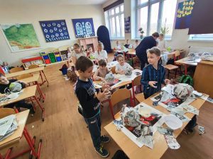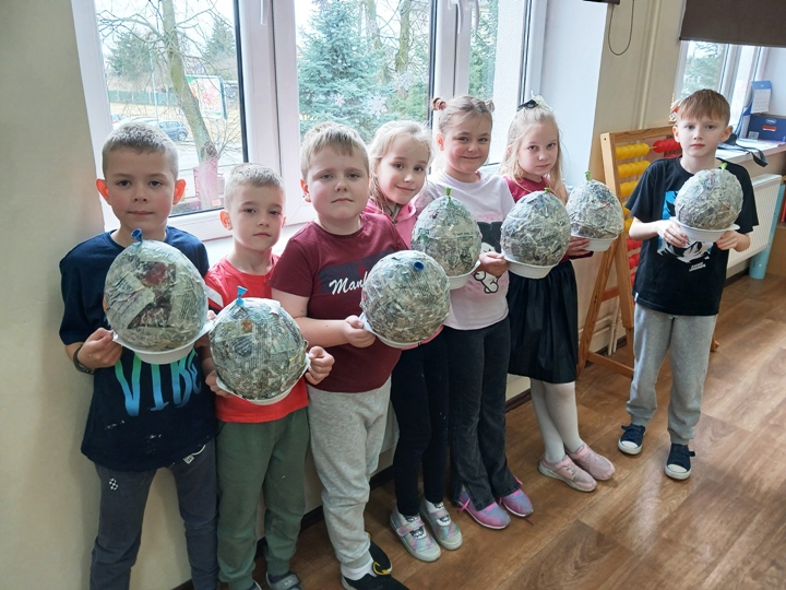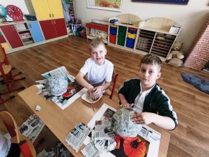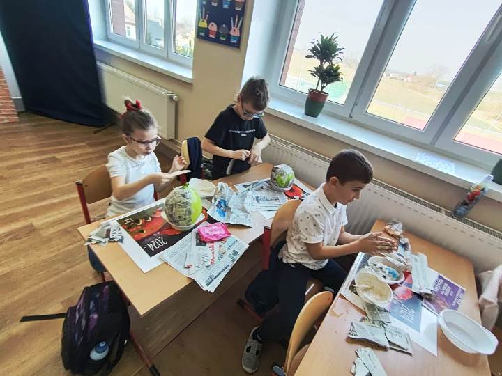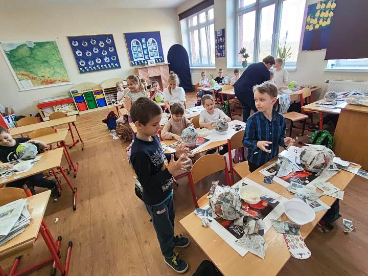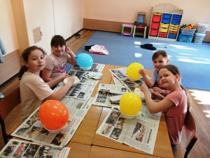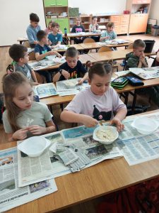 Uczniowie klas I wraz z wychowawcami biorą udział w innowacji pedagogicznej pt:. Czytanie się opłaca – książka i finanse w świecie pierwszaka. Jednym z puktów przedsięwzięcia są warsztaty plastyczne, podczas których uczniowie wykonują świnkę skarbonkę. Za nami pierwszy etap warsztatów! Podstawowym materiałem do wykonania skarbonki był nadmuchany balon, następnie przygotowanie kleju z mąki i wody oraz skrawki czarno-białych gazet. Dzieci nałożyły dwie warstwy masy papierowej. Podczas kolejnych warsztatów uczestnicy doklejać będą do masy uszy, nos i nogi. Po całkowitym utwardzeniu balon zostanie przebity i wyciągnięty. Etap trzeci to malowanie skarbonek. Dzisiaj przedstawiamy Państwu efekt pierwszego etapu warsztatów.