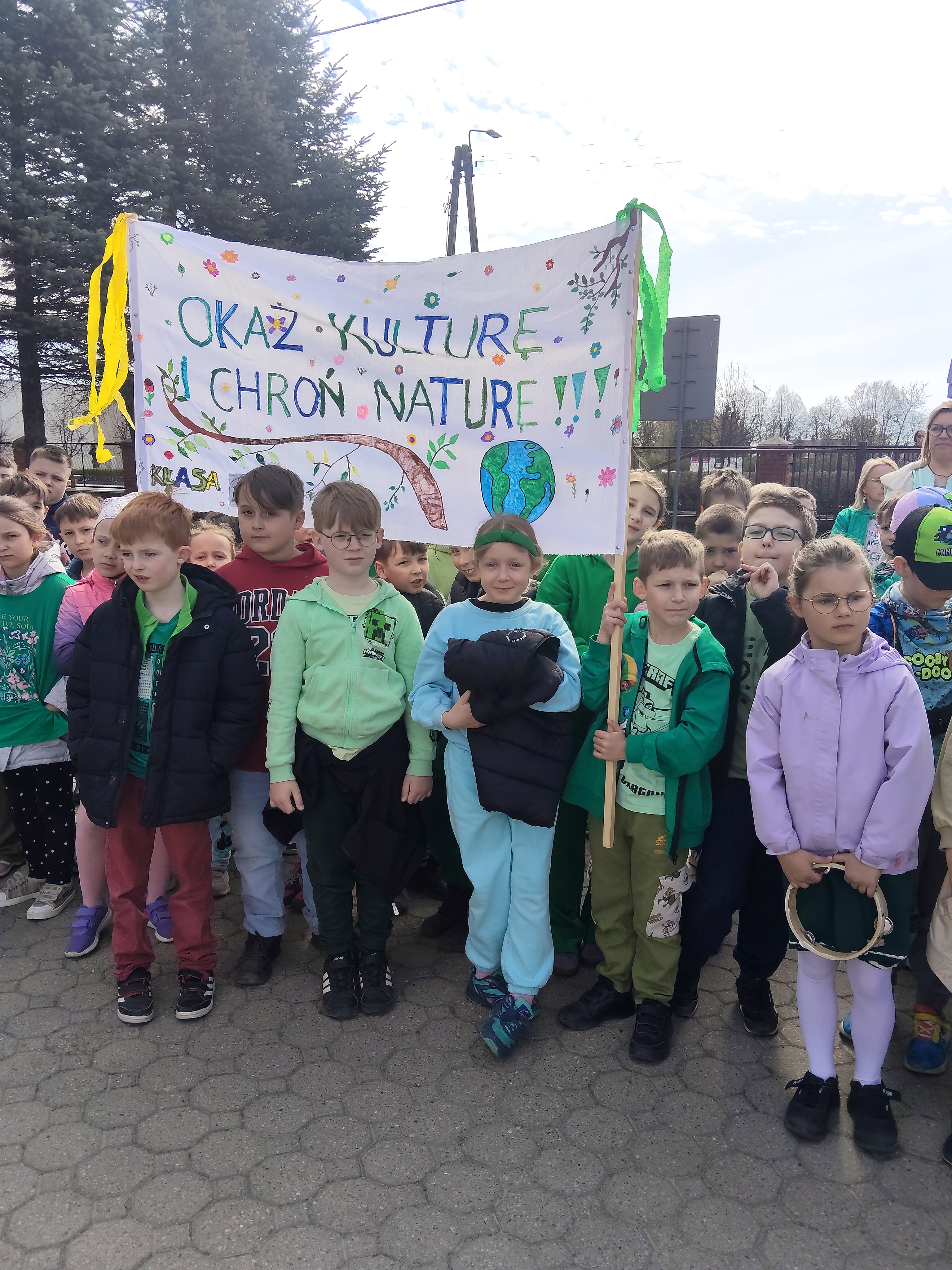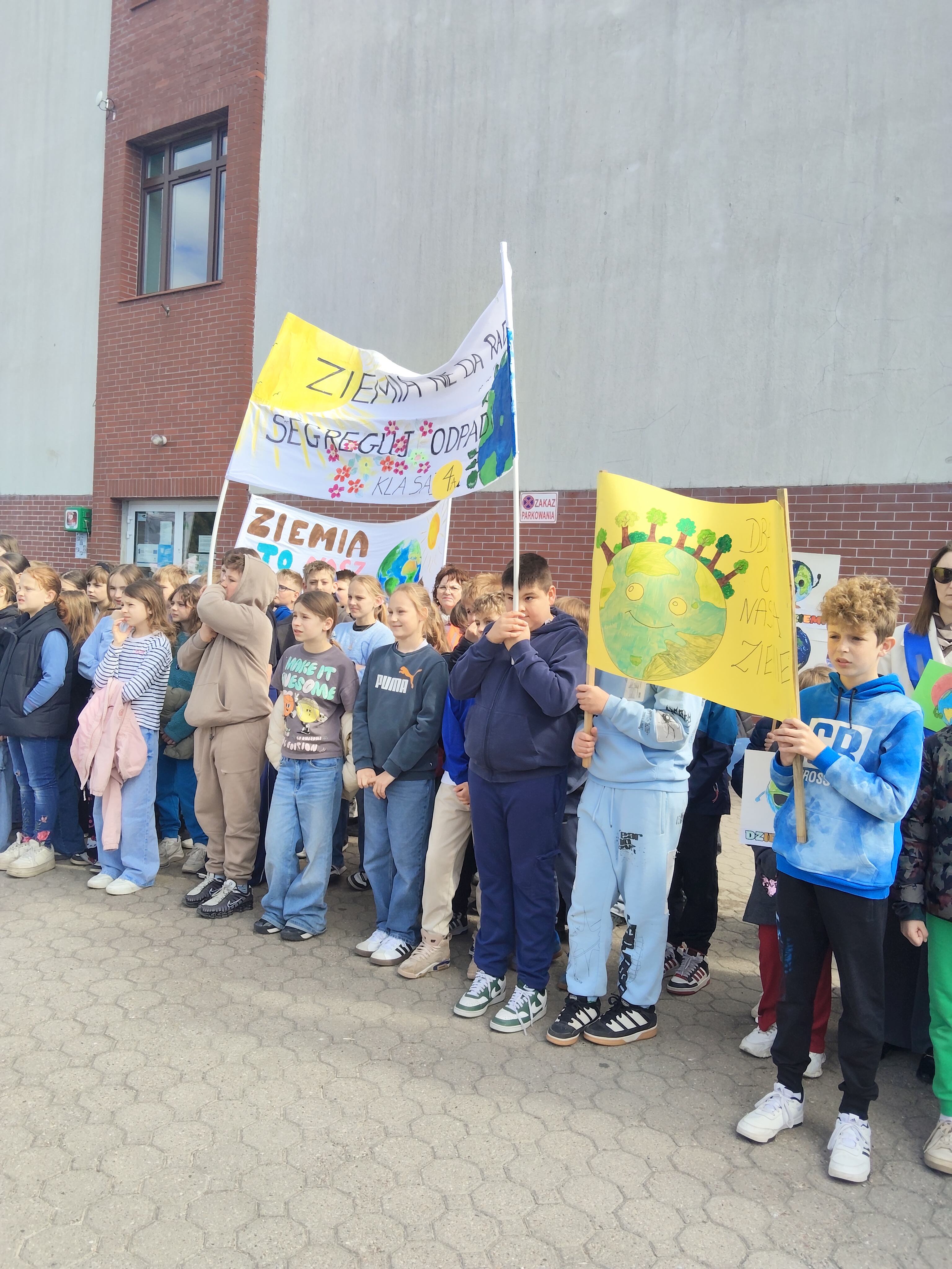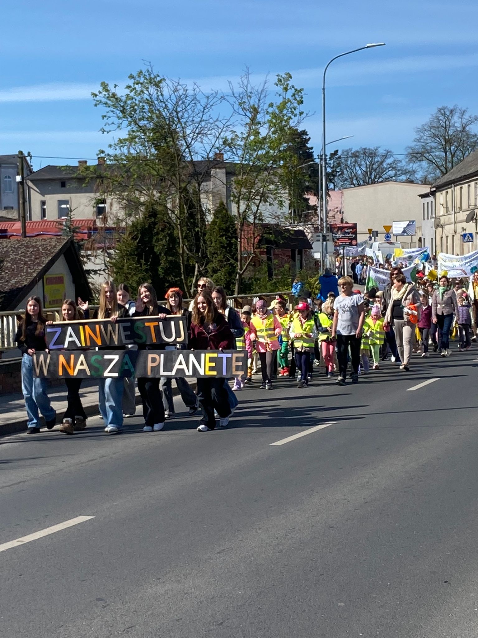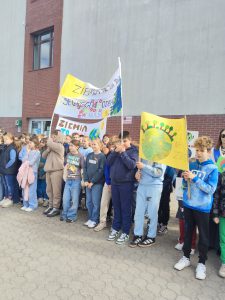 Przedpołudnie 22 kwietnia 2026r. wypełniło ulice naszego miasta niezwykłą energią. Uczniowie naszej szkoły postanowili zamanifestować swoją troskę o losy naszej planety biorąc udział w przemarszu z okazji Dnia Ziemi. O godzinie 10:00 pod eskortą policji, straży miejskiej i ratownictwa medycznego społeczność szkolna w barwnym korowodzie ruszyła do centrum Mroczy. W trakcie marszu uczniowie "zerówki" prezentowali własnoręcznie wykonane chorągiewki w kształcie drzew, młodsze klasy sygnalizowały swoją obecność grzechotkami. Wszyscy skandowali hasła związane z ochroną Ziemi. Pochód prowadziły uczennice z Samorządu Uczniowskiego niosąc motto przewodnie "Zainwestuj w naszą planetę", a za nimi podążała szkolna sekcja werblistów nadając tempo maszerującym. Nad głowami uczestników powiewały transparenty z hasłami, takimi jak: