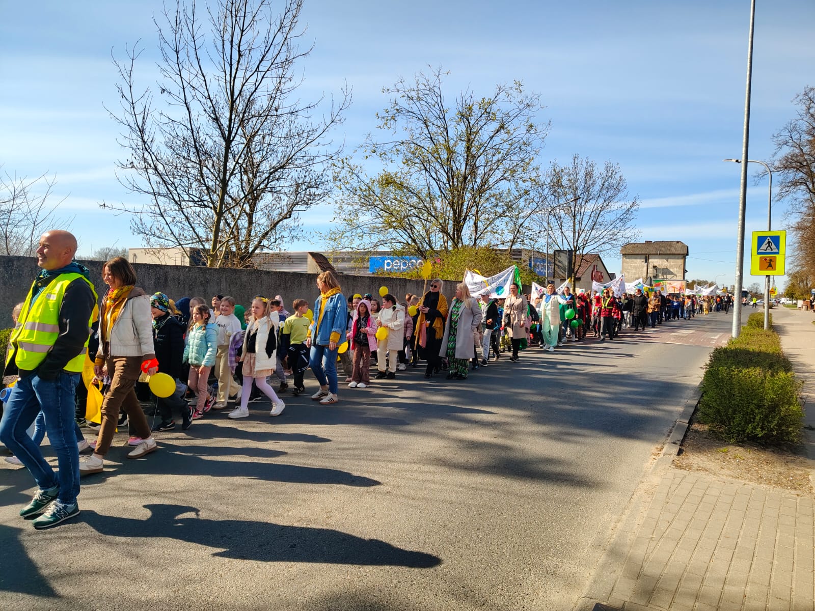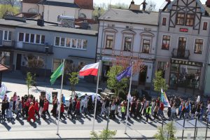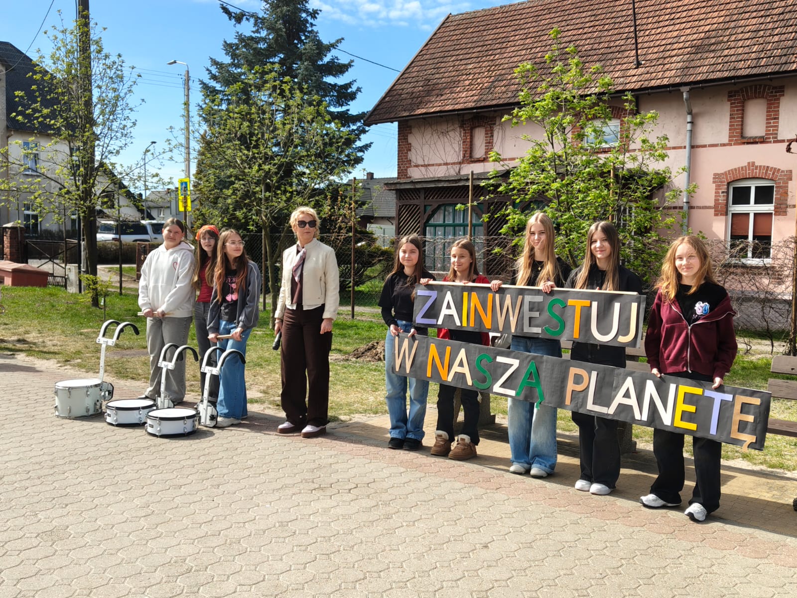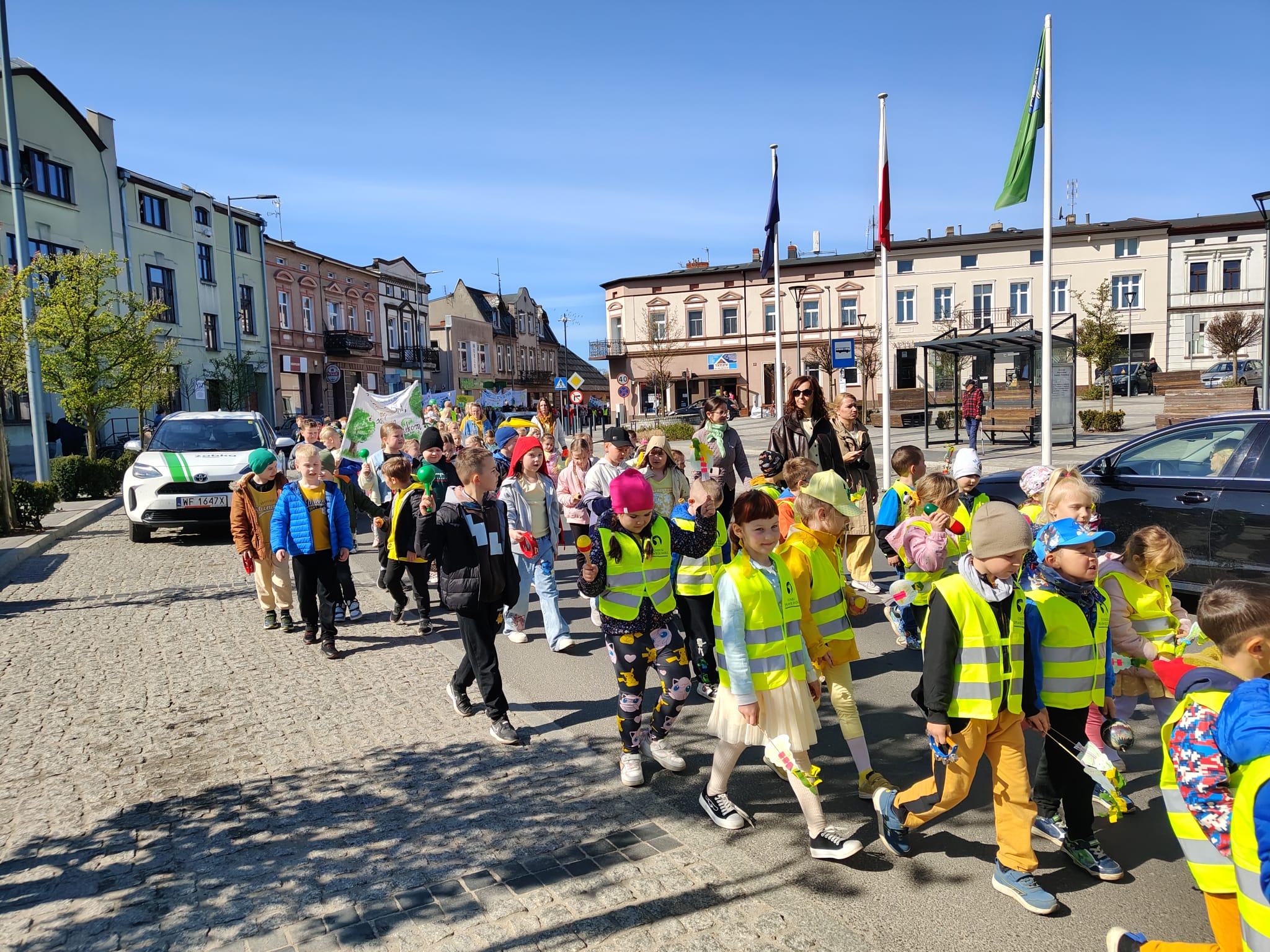 Przedpołudnie 22 kwietnia 2026r. wypełniło ulice naszego miasta niezwykłą energią. Uczniowie naszej szkoły postanowili zamanifestować swoją troskę o losy naszej planety biorąc udział w przemarszu z okazji Dnia Ziemi. O godzinie 10:00 pod eskortą policji, straży miejskiej i ratownictwa medycznego społeczność szkolna w barwnym korowodzie ruszyła do centrum Mroczy. W trakcie marszu uczniowie "zerówki" prezentowali własnoręcznie wykonane chorągiewki w kształcie drzew, młodsze klasy sygnalizowały swoją obecność grzechotkami. Wszyscy skandowali hasła związane z ochroną Ziemi. Pochód prowadziły uczennice z Samorządu Uczniowskiego niosąc motto przewodnie "Zainwestuj w naszą planetę", a za nimi podążała szkolna sekcja werblistów nadając tempo maszerującym. Nad głowami uczestników powiewały transparenty z hasłami, takimi jak: