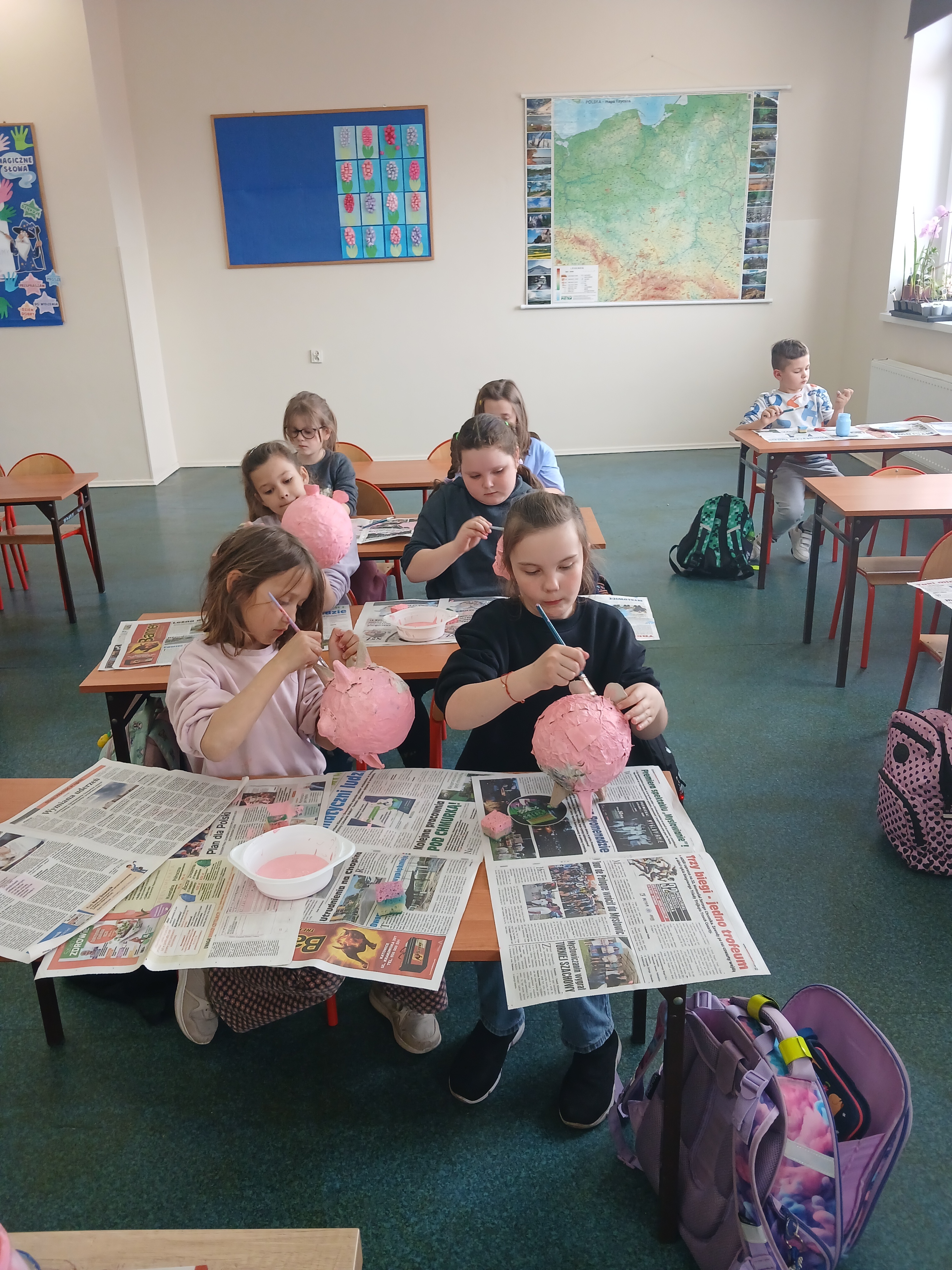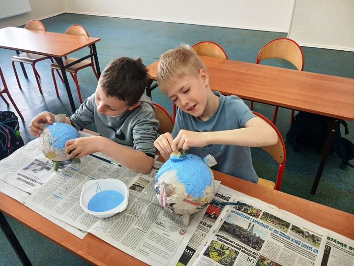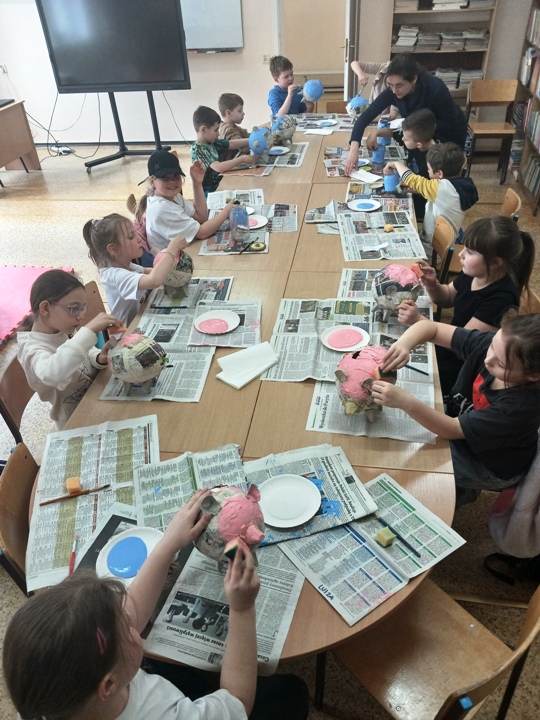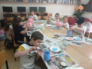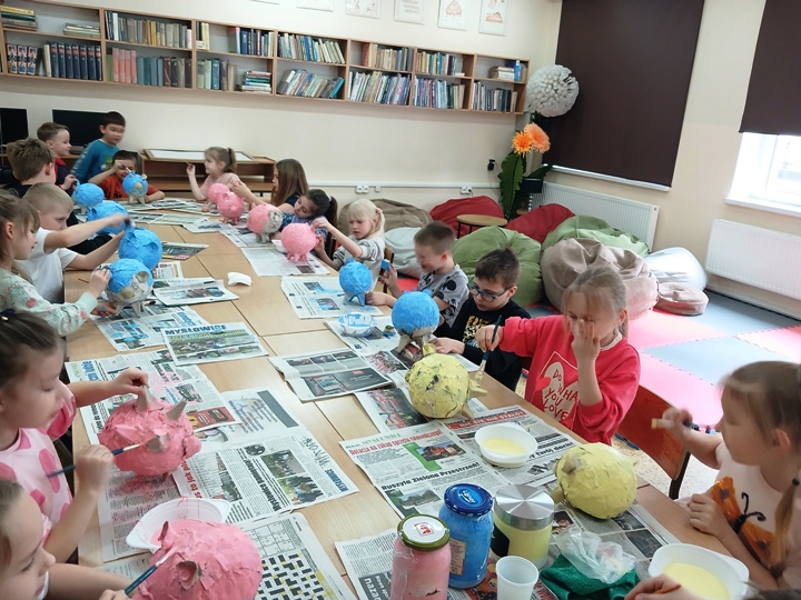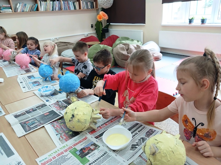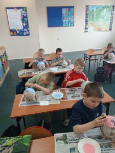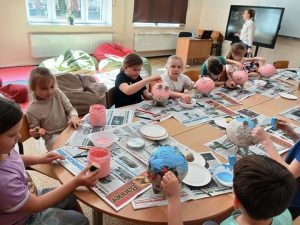 Uczniowie klasy 1a, 1b, 1c, 1d zakończyli wieloetapowe warsztaty plastyczne tworzenia skarbonki metodą papier- mache (mąka i gazety). Podczas trzeciego etapu warsztatów dzieci eksperymentowały z kolorami, malowały pędzlem, gąbką strukturę skarbonki, ozdabiały swoje dzieła. Samodzielne wykonanie skarbonki sprawiło dzieciom dużo radości. Warsztaty były bardzo kreatywne, wymagały dużej cierpliwości, koncentracji i twórczego myślenia. Efektem warsztów są piękne skarbonki!