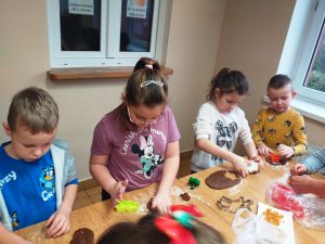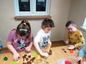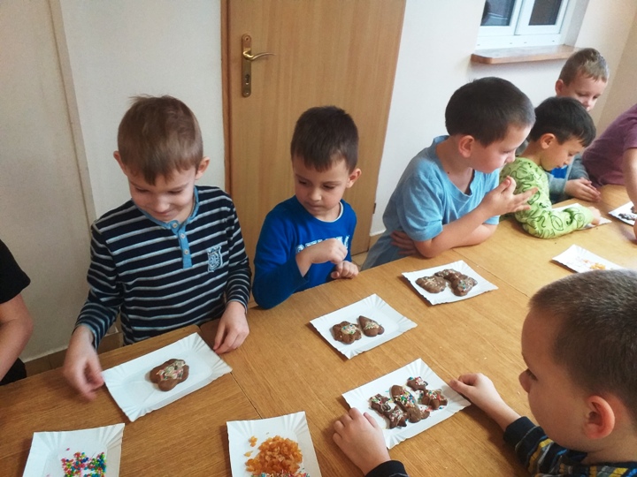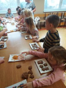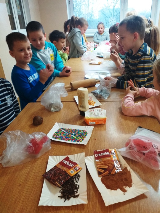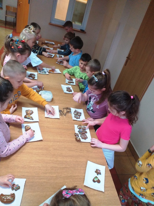 Grupa przedszkolna "Motylki" uczestniczyła w warsztach kulinarnych, w ramach których powstały pierniczki. Dzieci poznały tajniki przepisu, miały okazję zapoznać się z niezbędnymi przyprawami i składnikami do ciasta takimi jak goździki, cynamon, miód, cytryna, mąka. Każdy kucharz miał za zadanie wyrobić swoje ciasto, następnie rozwałkować i wykroić dany kształt za pomocą foremki. Zapach pieczonego ciasta rozchodził sie po całej szkole. Następnie dzieci za pomocą lukru, czekolady, posypki i skórki pomarańczy ozdabiały ciasteczka. Zadanie sprawiło dzieciom niesamowitą frajdę! Zadanie zrealizowane zostało w ramach innowacji pedagogicznej Sensoryczna podróż po Polsce – Poznaj Polskę wszystkimi zmysłami. Koordynatorzy: Murach Magdalena, Ilona Krzyżan.