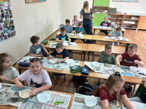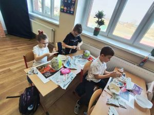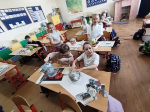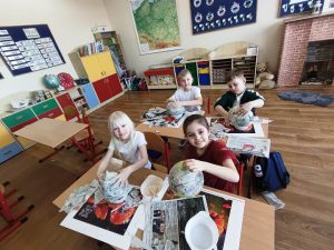 Uczniowie klas I wraz z wychowawcami biorą udział w innowacji pedagogicznej pt:. Czytanie się opłaca – książka i finanse w świecie pierwszaka. Jednym z puktów przedsięwzięcia są warsztaty plastyczne, podczas których uczniowie wykonują świnkę skarbonkę. Za nami pierwszy etap warsztatów! Podstawowym materiałem do wykonania skarbonki był nadmuchany balon, następnie przygotowanie kleju z mąki i wody oraz skrawki czarno-białych gazet. Dzieci nałożyły dwie warstwy masy papierowej. Podczas kolejnych warsztatów uczestnicy doklejać będą do masy uszy, nos i nogi. Po całkowitym utwardzeniu balon zostanie przebity i wyciągnięty. Etap trzeci to malowanie skarbonek. Dzisiaj przedstawiamy Państwu efekt pierwszego etapu warsztatów.