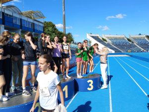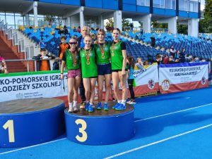 Bardzo dobrze zaprezentowały się nasze lekkoatletki w Województwie Kujawsko-Pomorskich Igrzysk Młodzieży Szkolnej w Festiwalu Sztafet, który odbył się 25 września na stadionie Zawiszy w Bydgoszczy, gdzie w stawce 15 zespołów zajęły wysokie 3 miejsce za reprezentacją SP 15 Bydgoszcz i SP Białe Błota. Dziewczęta wystartowały w sztafecie olimpijskiej na którą składa się 800 m-400 m-200m-100 m-razem 1500 m w kolejności Lena Jóźwiak, Zuzanna Dziamecka, Wiktoria Różycka i Julia Rosa. Wielkie brawa należą się naszym lekkoatletkom!!! Opiekun: Wiesław Śmieliński.